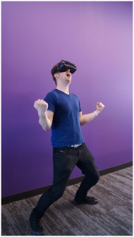 Adult male enjoying virtual reality, expressing excitement with VR headset against a purple wall.
