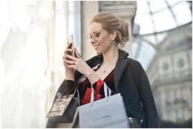 Stylish woman with shopping bags using smartphone in Milano, Italy. Perfect urban tech and fashion capture.