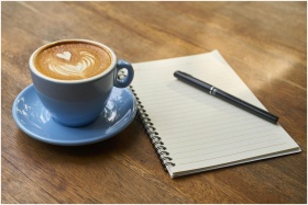 A calming scene of a latte with art in a blue cup beside a notebook and pen on a wooden table.