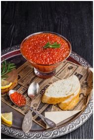 Elegant serving of red caviar with bread and lemon