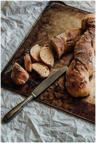 Freshly baked rustic bread loaf with slices on a t