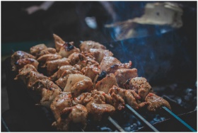 Delicious grilled skewers sizzling on a charcoal g