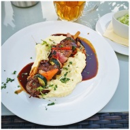 Close-up of delicious kebabs on creamy mashed pota