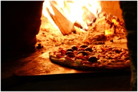 Delicious pizza baking in a traditional wood-fired