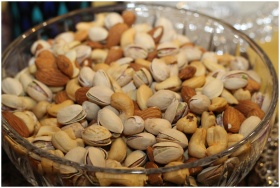 A close-up view of a glass bowl filled with various mixed nuts, including almonds, cashews, and pistachios.