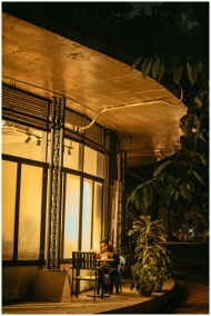 Nighttime street scene showcasing a food stall wit