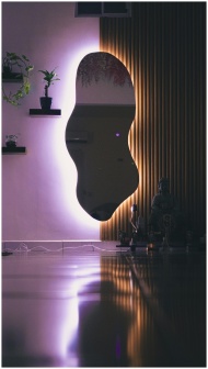 Elegant abstract mirror reflecting subtle indoor lighting, creating a serene and artistic atmosphere.