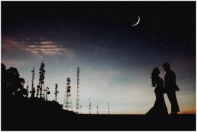 A couple's silhouette against a starry sky with a crescent moon and communication towers, creating a romantic ambiance.