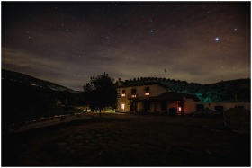 A serene landscape with a starry sky and a warmly lit house at night.
