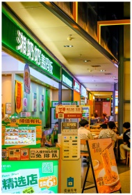 Bustling Asian mall food court with neon signs and patrons dining, creating a lively atmosphere.