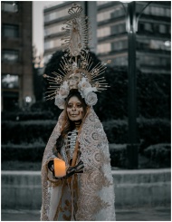 Woman in skeleton makeup and ornate costume holds