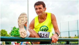 Senior man stretches before outdoor track run. Bright day for fitness.