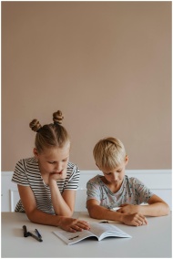 Two children focused on a book, emphasizing learning and togetherness.