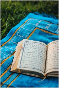 An open Quran rests on a blue prayer mat in an outdoor park setting, capturing peaceful spirituality.