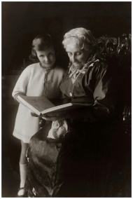 A heartwarming vintage photo of a grandmother reading to her granddaughter.