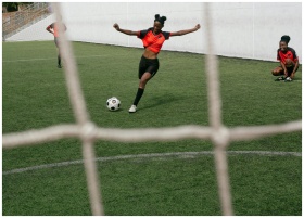 Women soccer players practicing on a green field,