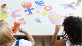 Two children enjoying an art class with colorful paper cutouts, fostering creativity and fun.