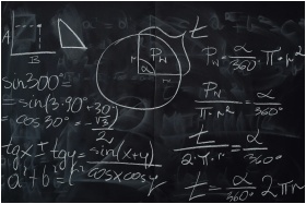 A classroom with a blackboard displaying mathemati