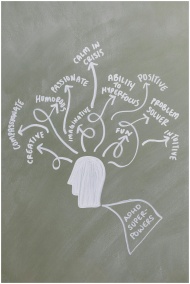 Chalkboard with a mind map illustrating ADHD superpowers like creativity and humor.