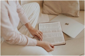 A woman in casual attire reads a book beside a laptop while sitting on a cozy sofa.