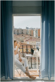 A young woman enjoys a quiet moment on her balcony, sipping coffee alongside her cat and laptop.