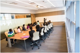 A diverse group actively collaborating in a bright, modern conference room setting.