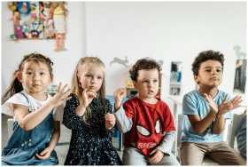 A group of diverse children engaged in a fun activity in a preschool classroom setting.