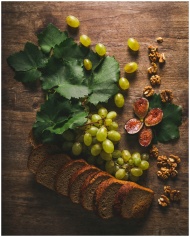 Rustic still life of grapes, sliced bread, figs, a