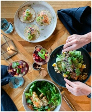 Top view of a vibrant vegetarian meal with tacos,