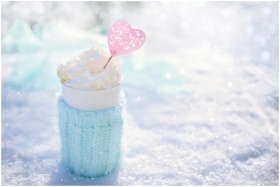 Warm beverage topped with cream in snow, perfect f