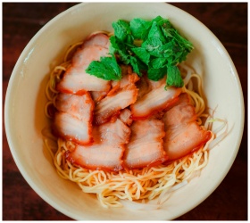 Appetizing bowl of pork noodles garnished with fre