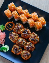A delicious assortment of sushi, featuring salmon rolls and grilled pieces garnished with sesame seeds.