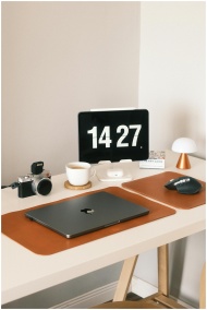 Stylish workspace with a laptop, digital camera, tablet clock, and modern decor.