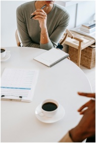 High angle crop professional female psychotherapist with pen and notepad listening attentively to client during psychotherapy session in light studio