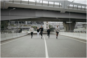A diverse group of people running on a city road, showcasing teamwork and fitness under an overpass.