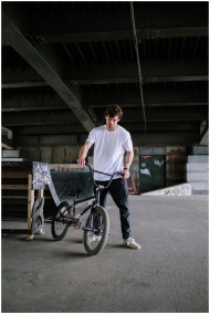 A man in a white t-shirt holds a BMX bike under a