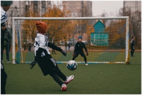 Children playing soccer on a cool autumn day in a park in Kyiv, Ukraine, enjoying outdoor sports.