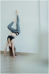 A woman in a sports bra and leggings performs a handstand indoors, showcasing flexibility.