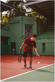 A young male tennis player bouncing a ball on an outdoor court. Perfect for sports-themed content.