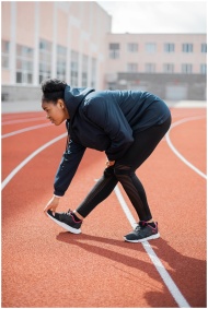 A plus size woman in activewear stretches on an outdoor track. Focus on determination and fitness.
