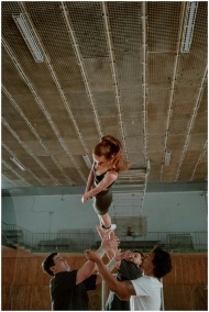 Group practicing a cheerleading stunt indoors with