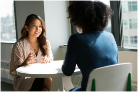 Two women sitting at a table having a professional