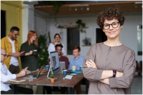 Smiling businesswoman with curly hair stands confidently in a modern office space with colleagues.