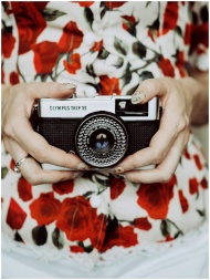 Close-up of hands holding a vintage Olympus Trip 35 camera against a floral blouse.