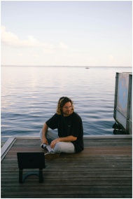A man with long hair sits on a pier by the sea usi