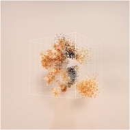 A conceptual 3D cube displaying abstract data visualization with dynamic particles.