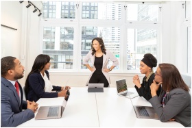 Diverse team engaged in a business meeting with laptops in a modern office setting.