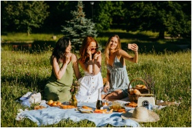 Three women enjoying a summer picnic in a park, capturing a selfie together.