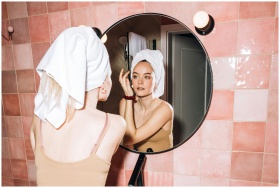 A young woman with a towel in a pink bathroom, reflecting in round mirror as she performs skincare.