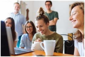 A group of friends enjoying a moment together indoors, smiling and watching a video on a laptop.